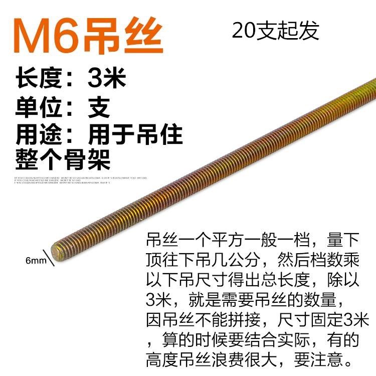 38 main keel 0.6mm thick 50 main keel 0.7mm thick 88 triangle keel 0.23mm thick 88 triangle keel 0.27mm thick 98 triangle keel 0.3mm thick pure white edge strip 0.45mm thick pure white edge strip 0.5mm thick M6 boom M8 boom 38 big crane 10 50 big crane 10 M6 expansion + nut 10 sets M8 expansion + nut 10 sets Tricular keel hanging piece 10 triangle keel joint 10 silver ash edge strip 0.5 thick