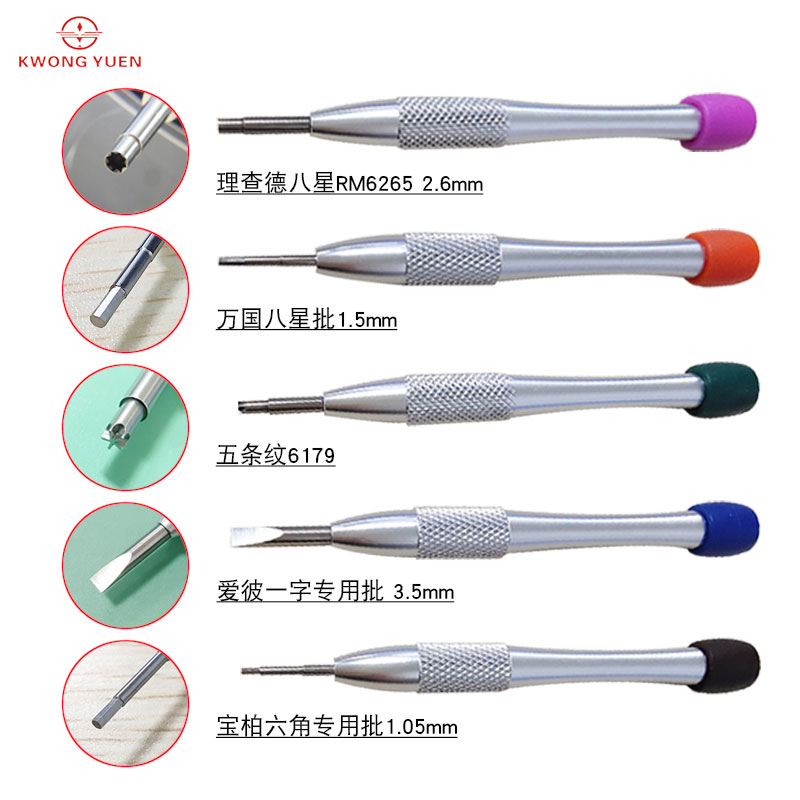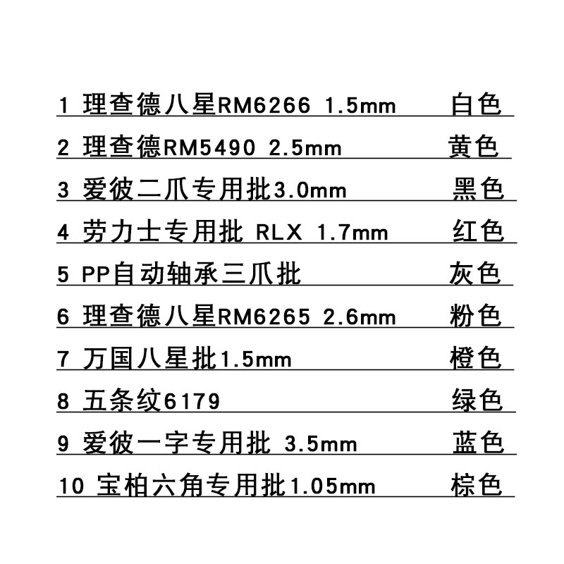 Table screwdriver Richard Eight Star RM6266 1.5mm Richard RM5490 2.5mm Audemars Piguet Special Batch 3.0mm Rolex Special Batch RLX 1.7mmPP Automatic Bearing Three-Prong Batch Richard Eight Star RM6265 2.6mm IW Eight Star Batch 1.5mm Five Stripes 6179 Audemars Piguet Special Batch 3.5mm Baobai HexagonAlline Special Batch 1.05mm