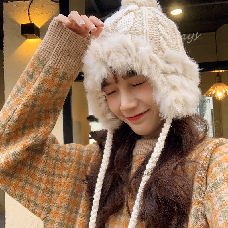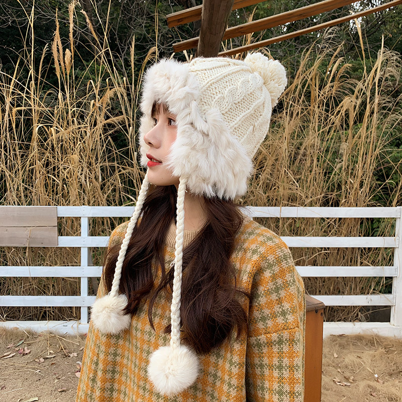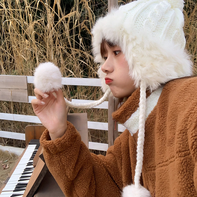 Velvet thickened hair ball Lei Feng hat girls Korean version ins cute beige knitted hat Ear warm wool hat