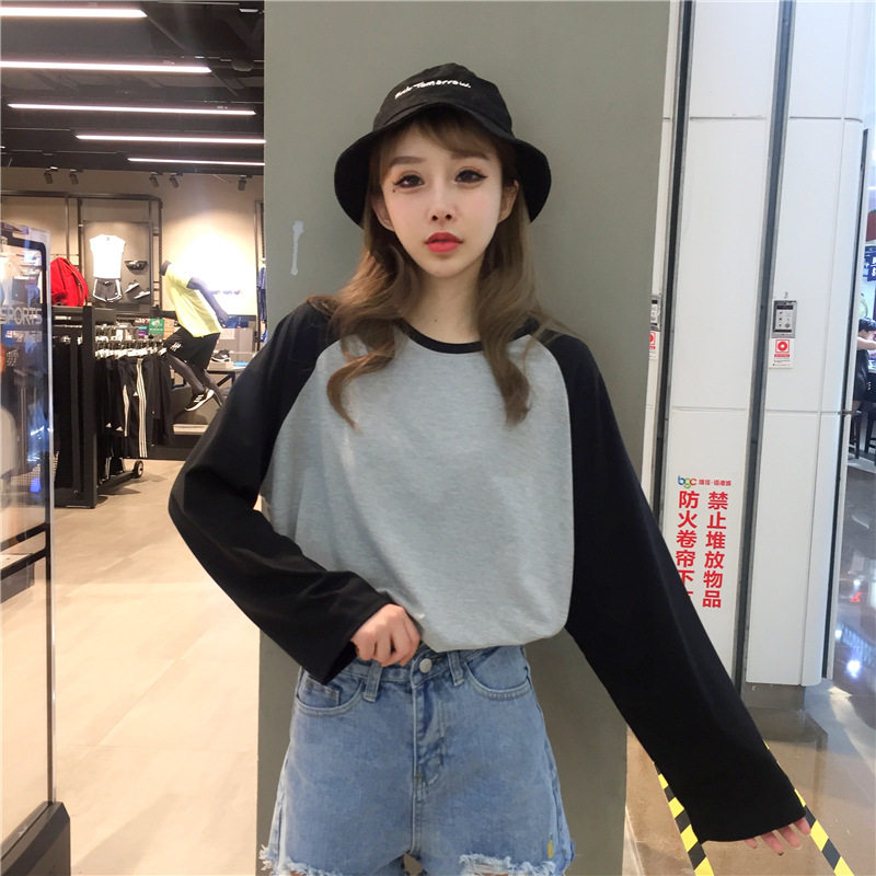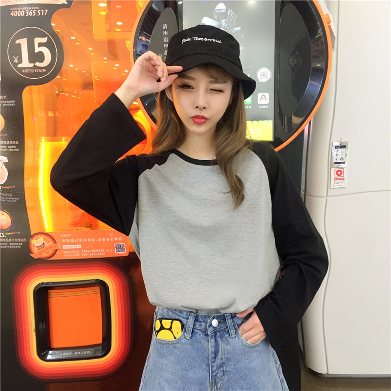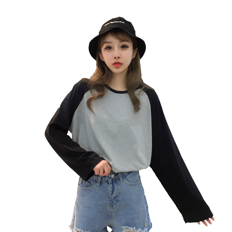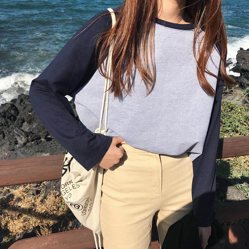Large size spring Euro-goods Xiaoshirts foreign pins Han version Collision Color Inserts shoulder sleeves Undershirt Loose long sleeves Women T-Shirt