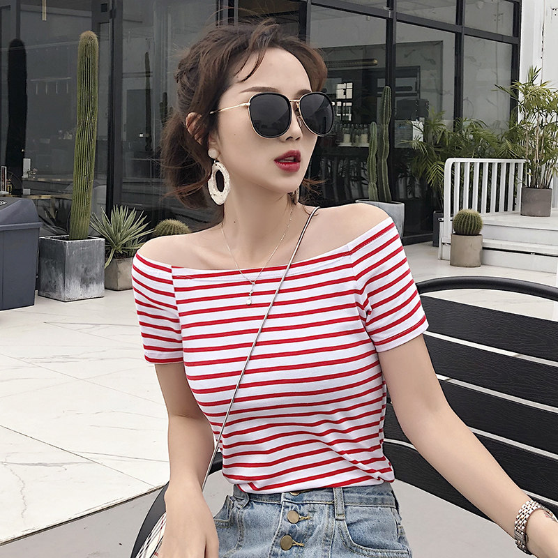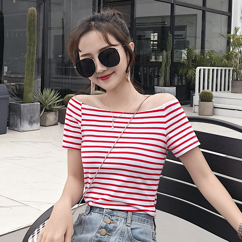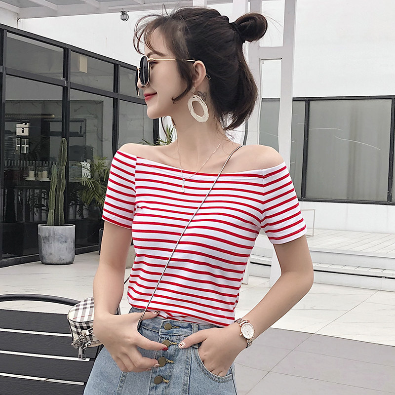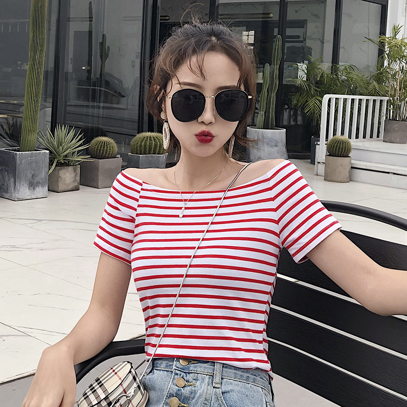 Word-lined open navel short sleeve t-shirt female Korean version Dew Shoulder Striped Blouse 2022ins Tide summer Nets for the undershirt