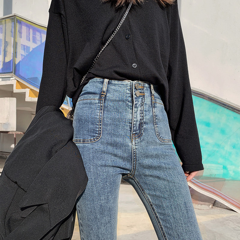 2022 women's high-waist autumn and winter jeans women's fleece tight-fitting slim-fitting nine-point pants new trendy winter