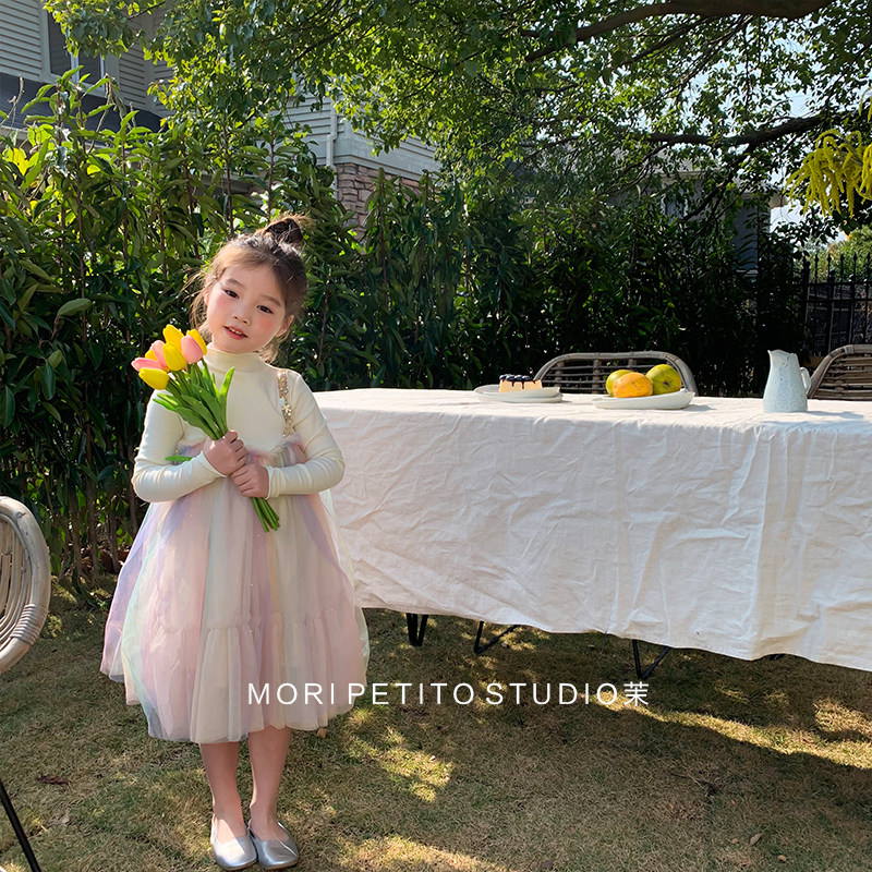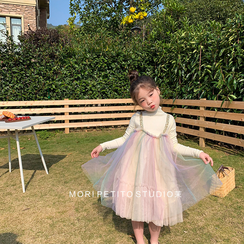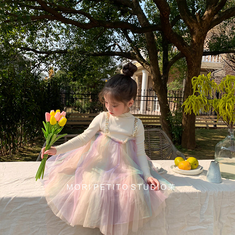 Girls rainbow gauze dress stitching fake two-piece sequined magic gauze skirt 2022 spring new princess dress