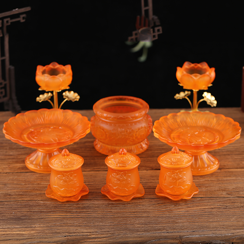Buddhist supplies Household glass offering cup offering set Offering plate Offering Buddha incense burner Offering Guanyin Buddha Hall A whole set of ornaments
