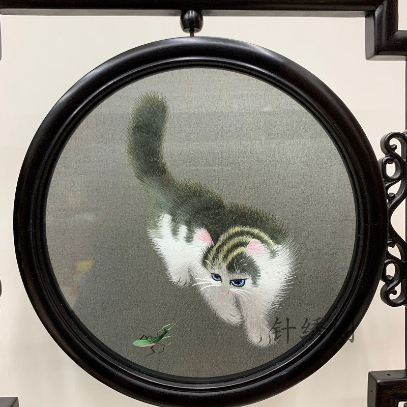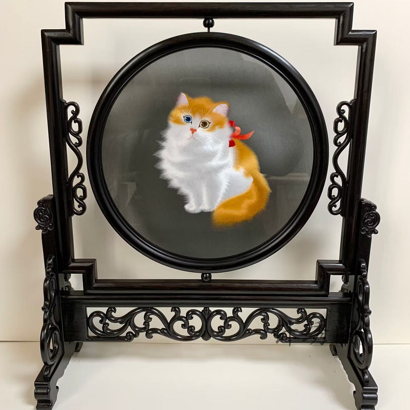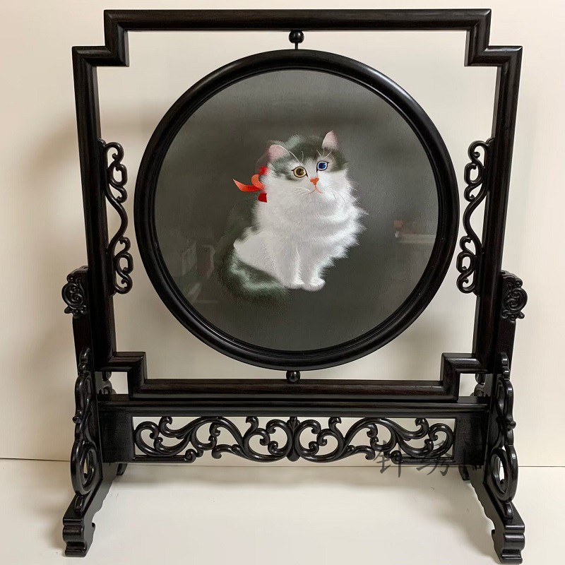 Handmade Su embroidered Exotic Cat Purple Light Sandalwood Rack Finished Products Double-sided Embroidery Embroidery Masterpiece Table Screen Gift-Taobao