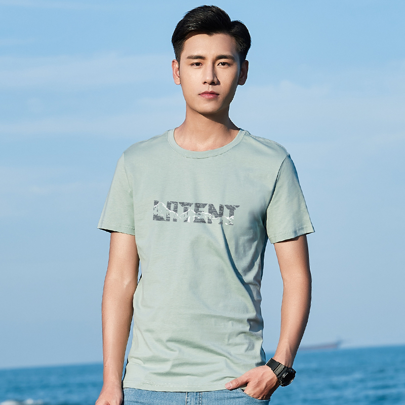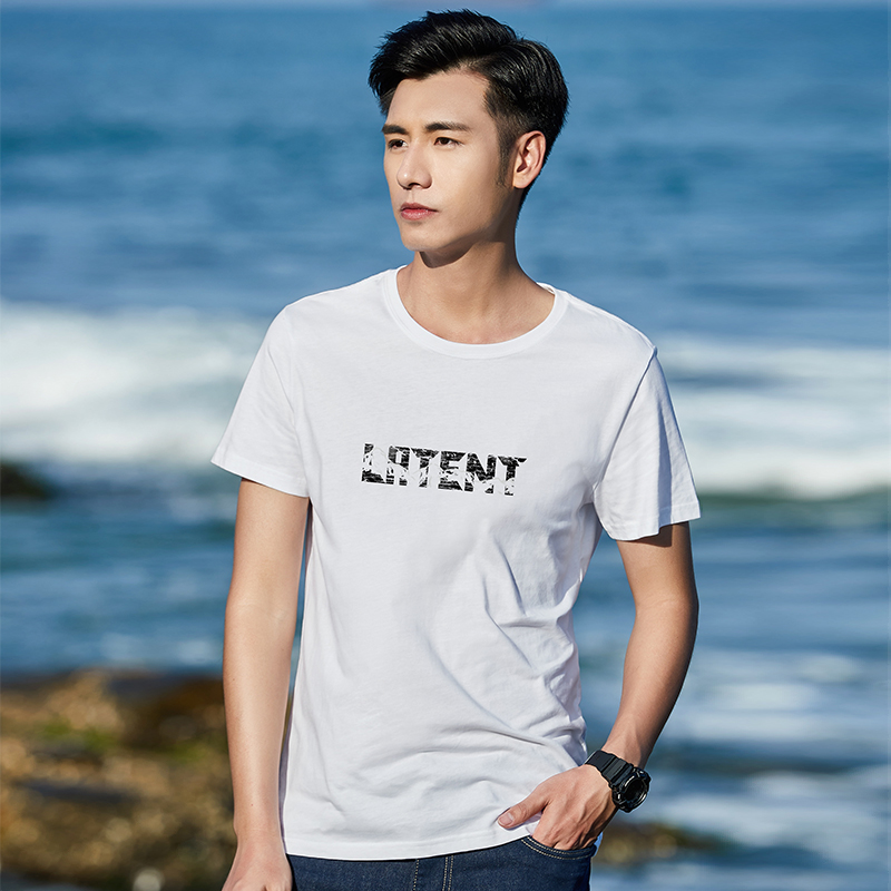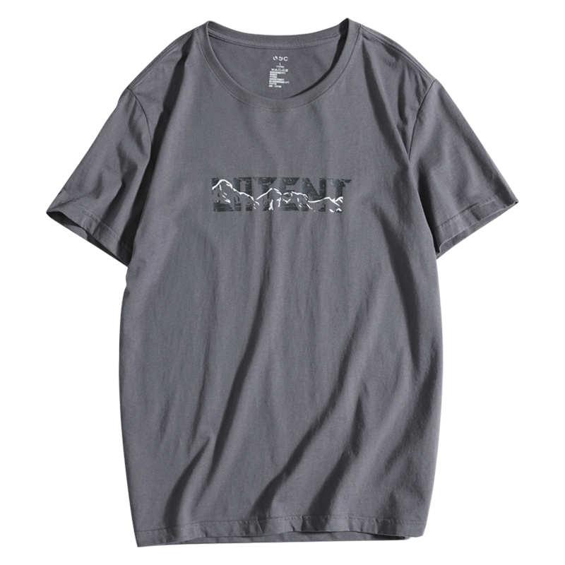 Hanska's new loose short - sleeved t - shirt men's pure cotton collar tide printed deep gray to bottom half sleeves