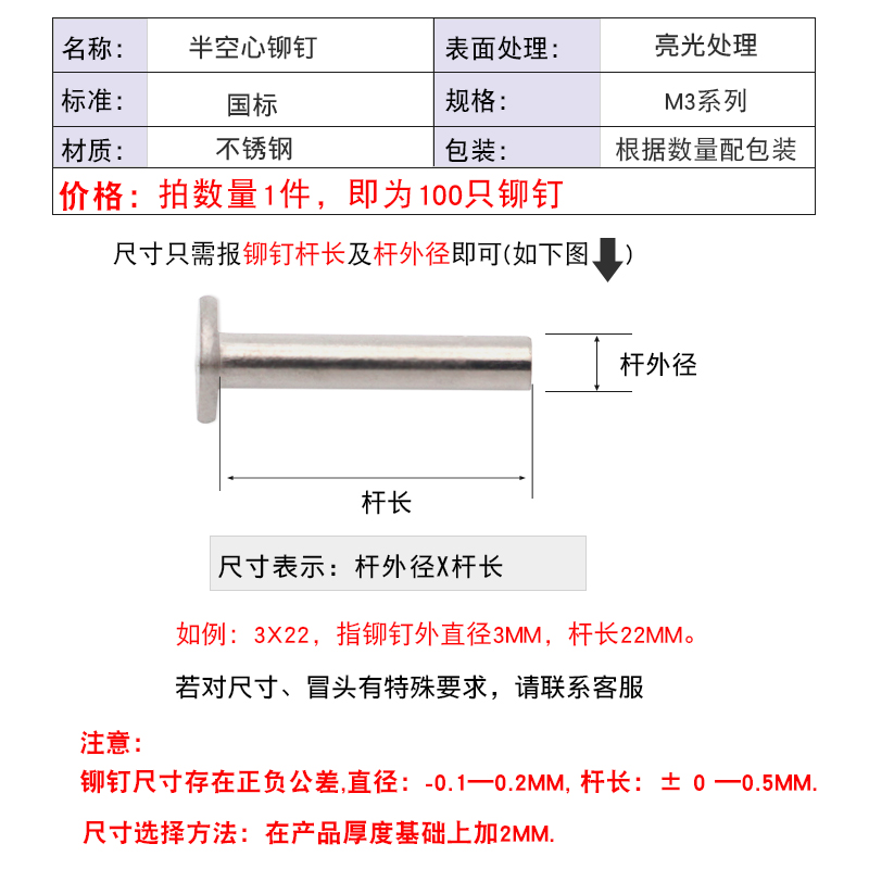 3mm stainless steel semi-hollow rivet flat head flat head hollow nail 304 Willow Ding ding tail hole nail 3-1