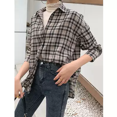 5 fold clearance French retro design sense niche shirt lazy shirt loose Curry colored plaid shirt women fold wear