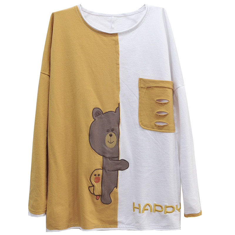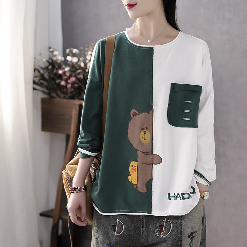 Han Suoyi retro literature and art early spring and autumn season new cloth embroidery bear loose large size top long-sleeved T-shirt women