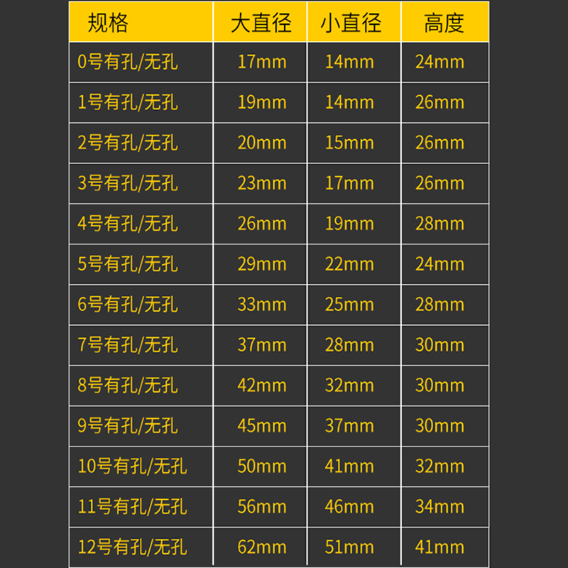 No. 0 (with or without holes) No. 1 (with or without holes) No. 2 with holes No. 2 without holes No. 3 with holes No. 3 without holes No. 4 with holes No. 4 without holes No. 5 without holes No. 6 with holes