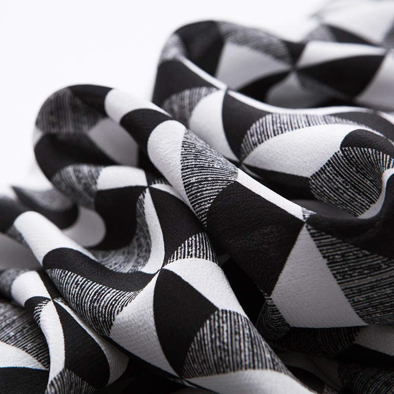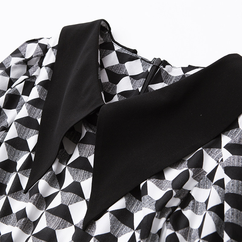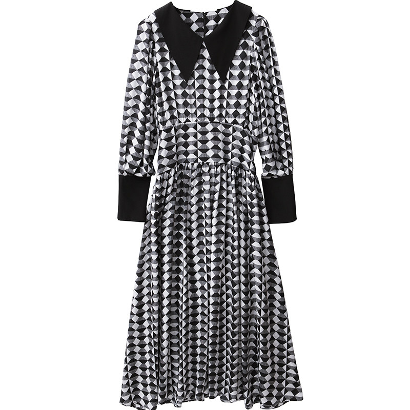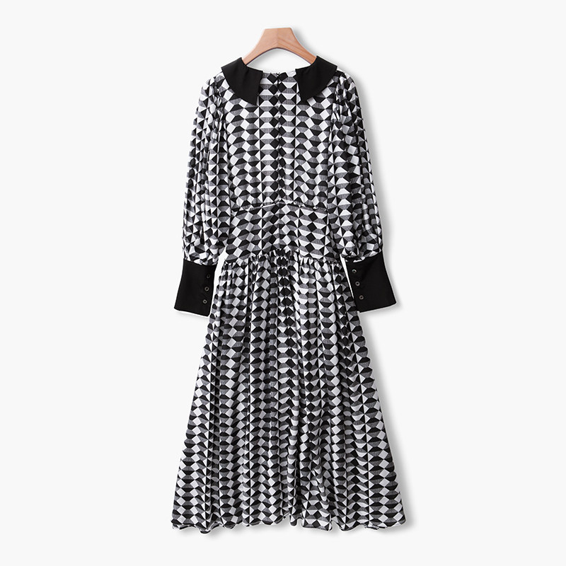 Retro Hepburn Exaggerated Large Turnover Black & White Geometric Printed Collection Waist Large Umbrella Swing Lantern Cuff Real Silk Dress H