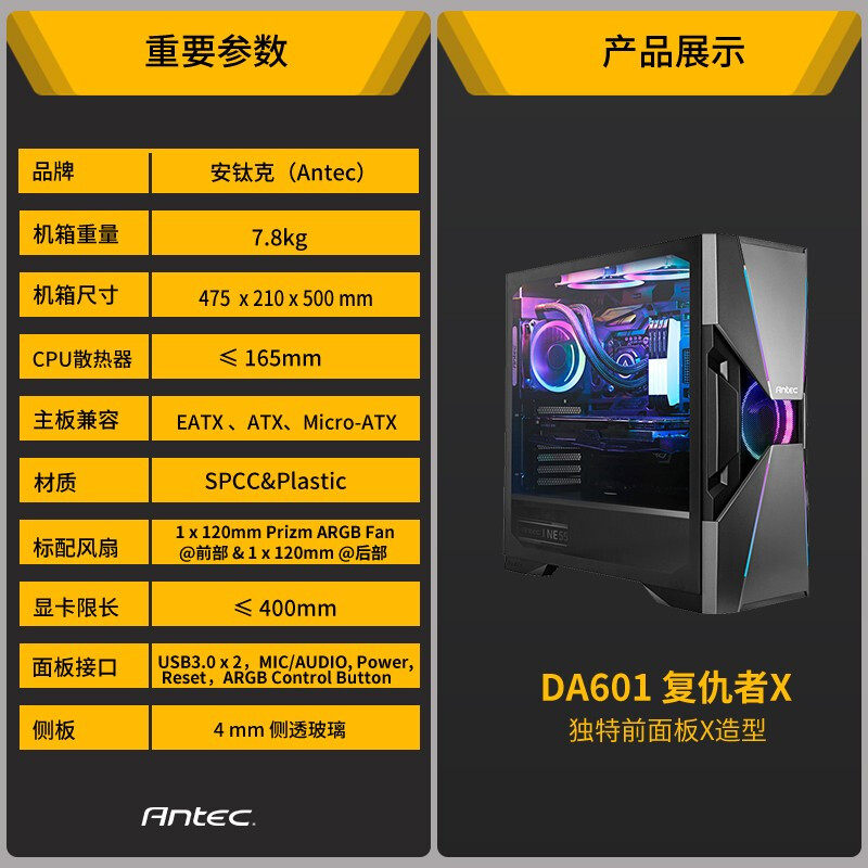 Antitank Avenger X DA601 main shell full side transparent middle tower water-cooled desktop computer host computer ATX game personality diy gold power supply 750W 850W