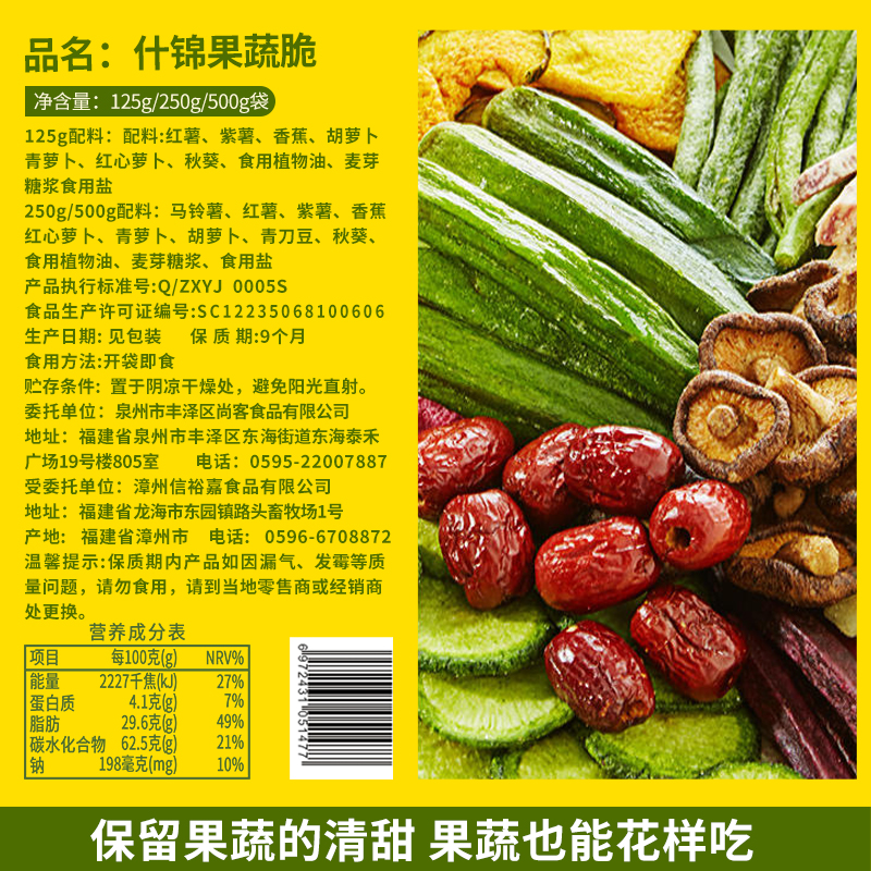 A total of 250g whole package is recommended (125g of crispy fruits and vegetables will send the same paragraph 125g (10 kinds of fruits and vegetables including okra) 12 9 A total of 2 bags of 120g (120g of crispy fruits and vegetables will send the same paragraph 120)