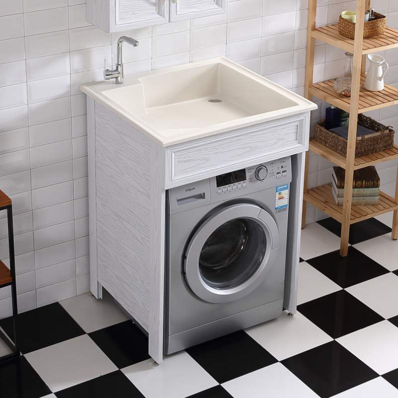 Includes washing machine cabinet with matching basin with faucet