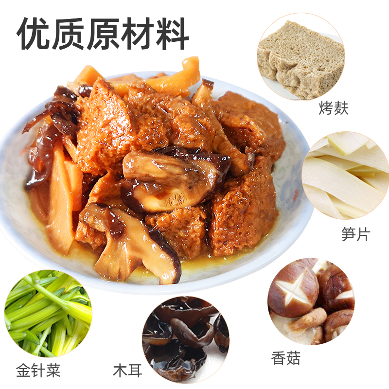 Roasted bran shoot slices vegetable oil water white sugar brewing soy sauce (including caramel color) golden needle vegetable fungus mushroom edible salt yellow wine spices, etc., subject to the actual information of the outer packaging of the product.