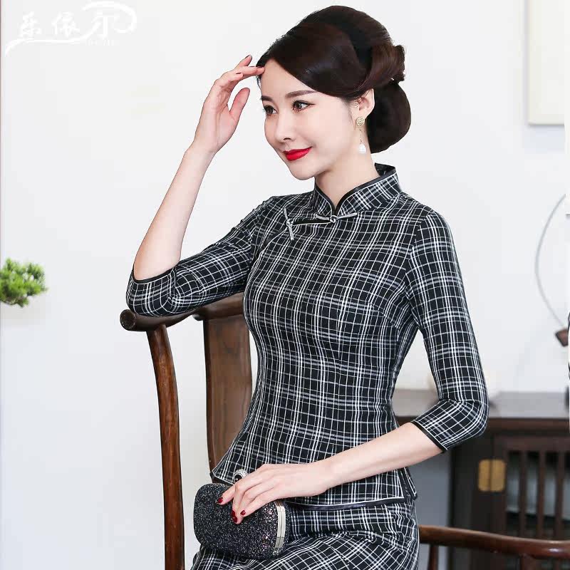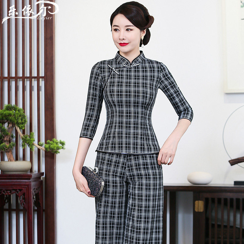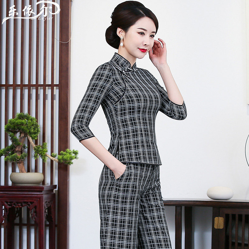 Summer new short-sleeved plaid cheongsam short top improved fashion Tang suit mother's two-piece set large size