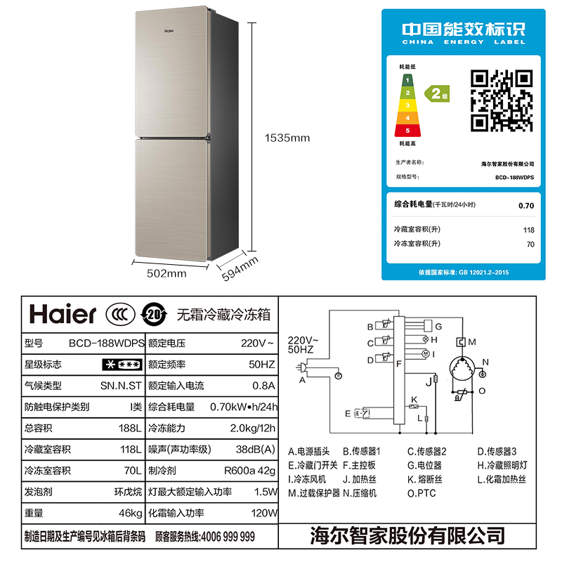 Haier refrigerator two doors two doors frost-free small household rental dormitory refrigerator BCD-188WDPS