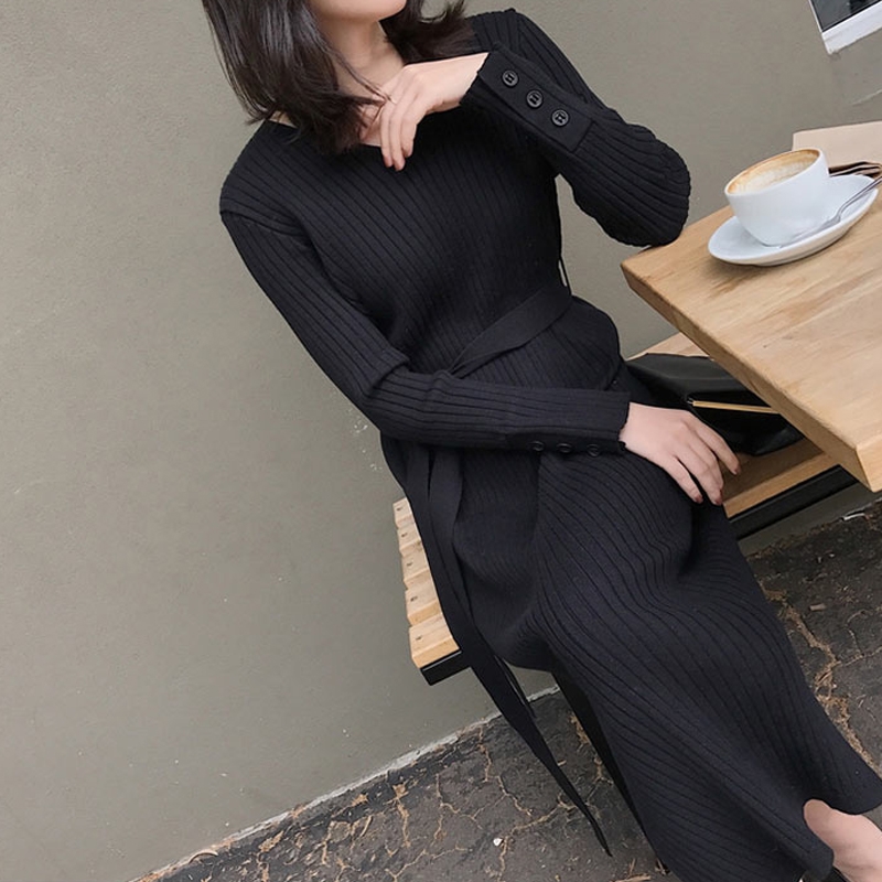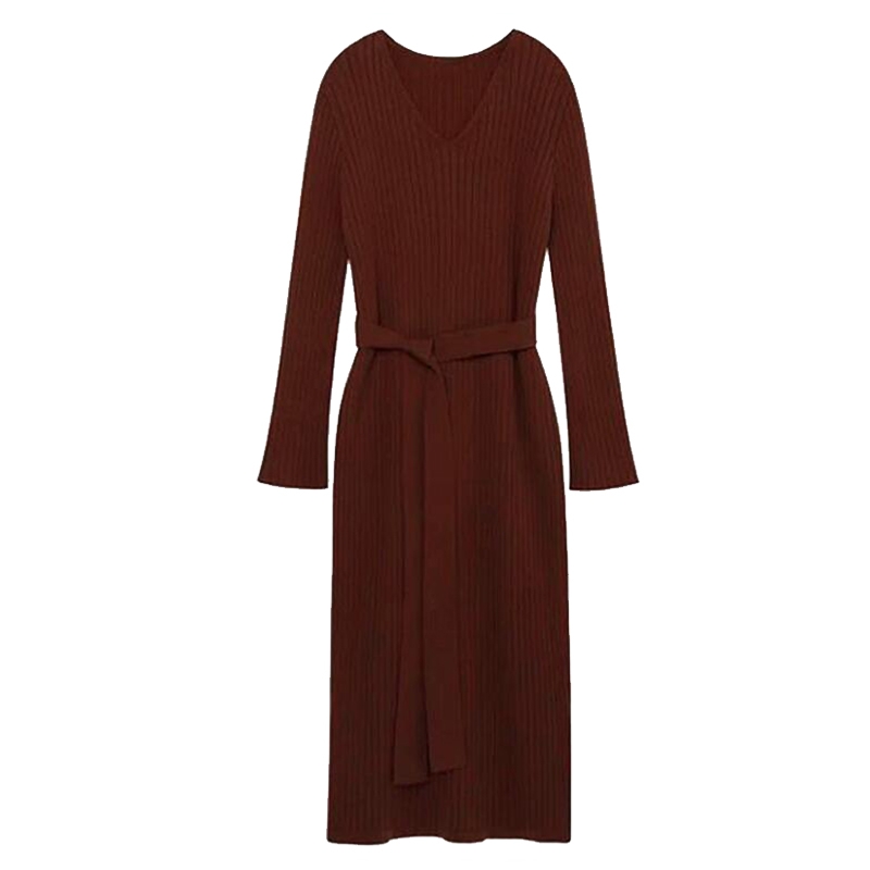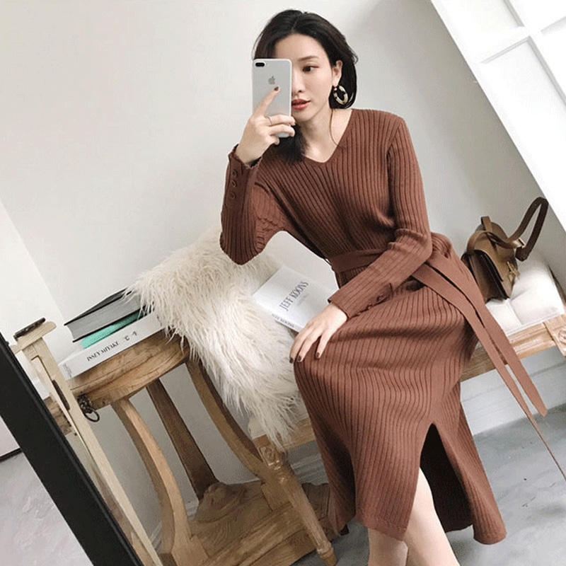 Europe station 2022 fall new knit inside lap dress Long sleeves Over Knee Long Version Thickened Sweater Skirt Woman