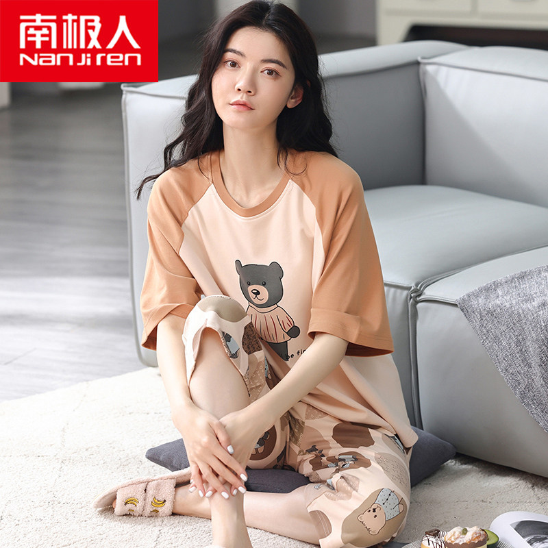 South Pole Pyjamas Women's Summer Pure Cotton Short Sleeves Seven Pants Suit Sweet and loose large size Fat mm Spring and Autumn Home Gun