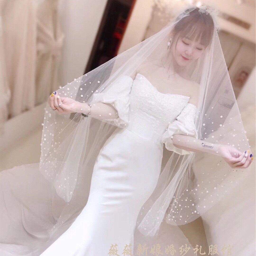 Head yarn meritocratic Korean style pearl bride wedding dresses white medium long version of the single sheet Brigades Filming the True Prop Head