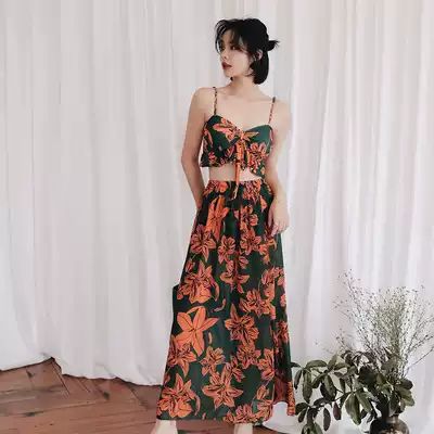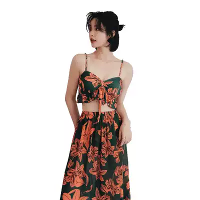 New couples swimsuit women's bikini two-piece skirt three-piece small chest gathers flowers seaside holiday couples
