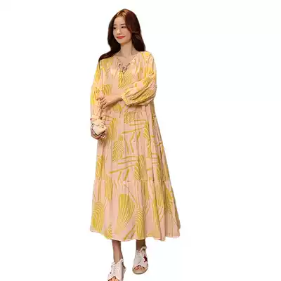 Large size women's seaside resort beach skirt chiffon yellow dress loose slim dress to ankle female summer
