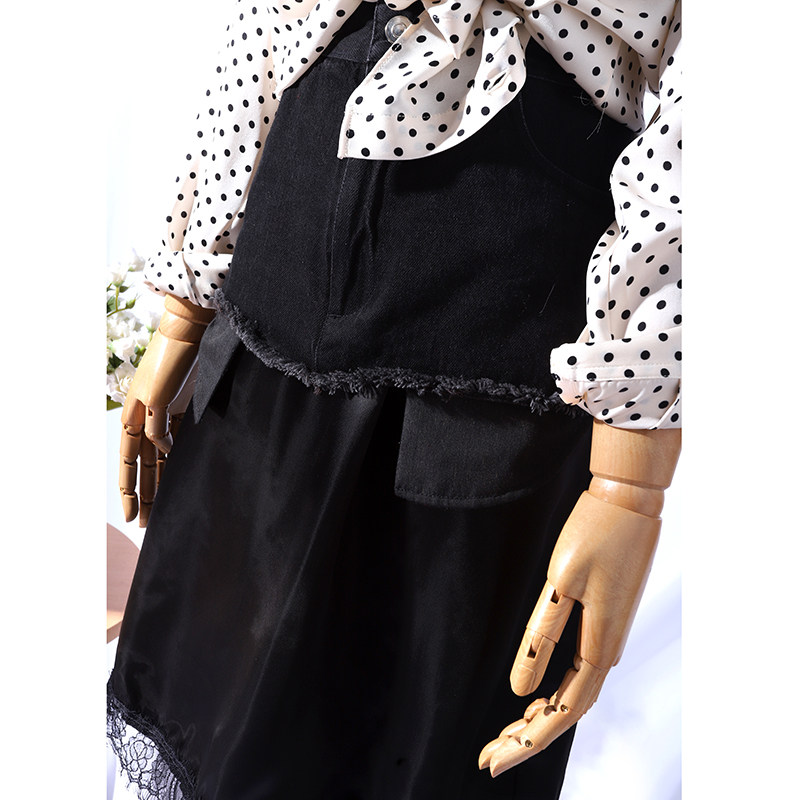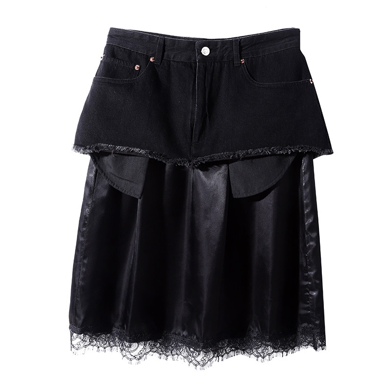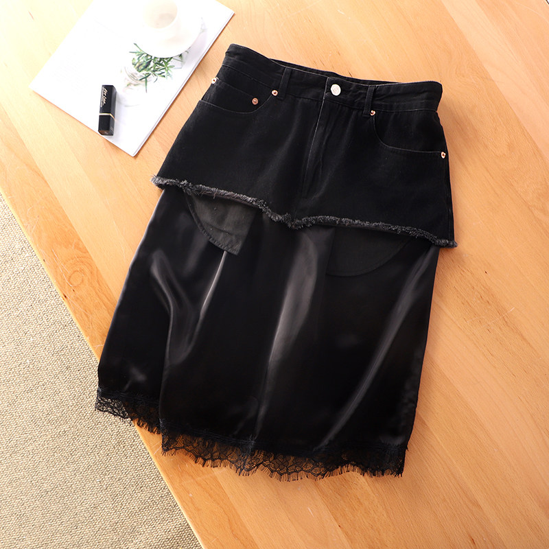 Cowboy parquet with small crowdsourced ~ eyelash lace splicing cotton female high waist straight drum in skirt half body dress 69802