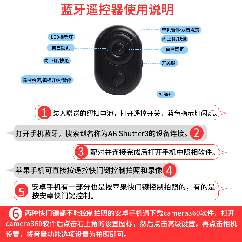 Bluetooth photo remote control black (send a grain of battery) Bluetooth photo remote control white (send a grain of battery) Huawei Android remote control black gift package version (can be fast-forward to turn the page for the song and friend circle point hymn)