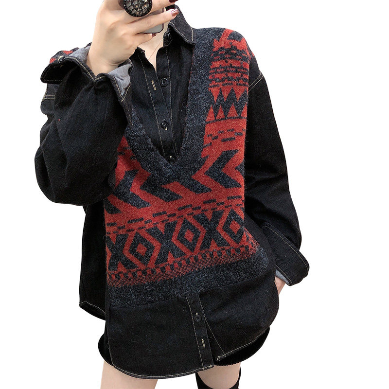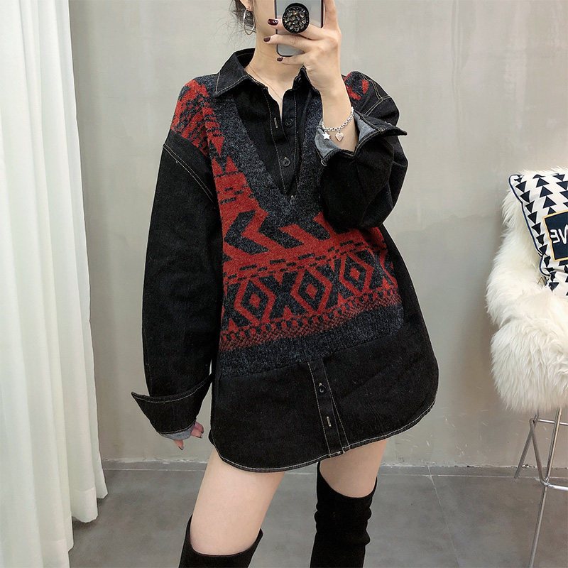 Retro ins tide design sense niche splicing denim shirt women 2022 autumn new European station European goods trend