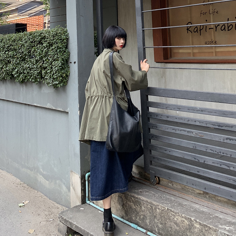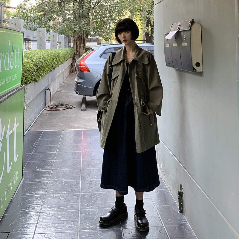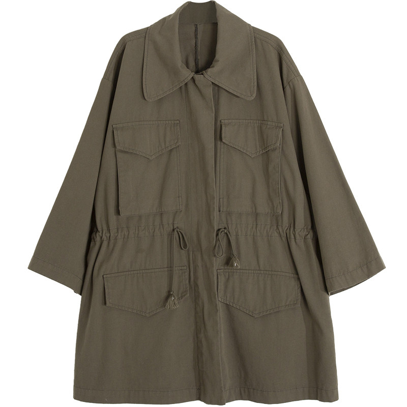 Frock coat women's 2021 autumn new army green medium and long version retro loose lace-up waist large lapel top