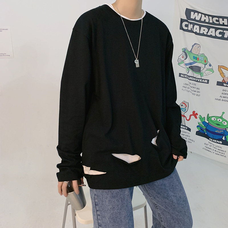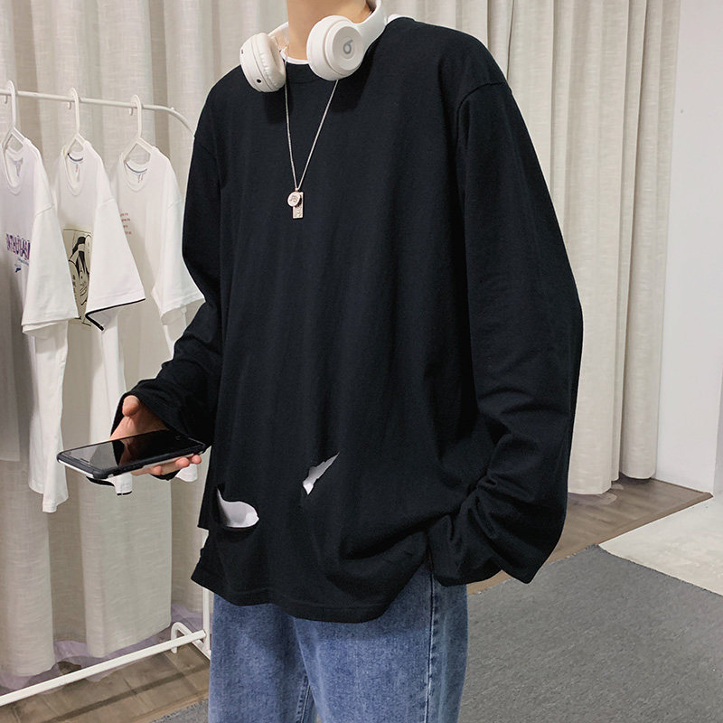 Long sleeve T-shirt male loose thin section Korean version Spring and autumn season Chauffins Tide High Street Breaking the bottom of the bottom Shirt 100 lap blouses