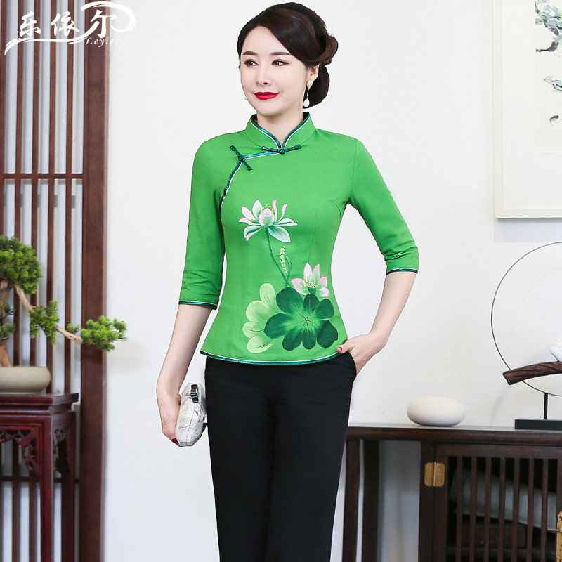 Summer new hand painted improved qipao blouses with short retro linen short sleeves Tang suit Mama dress Large size