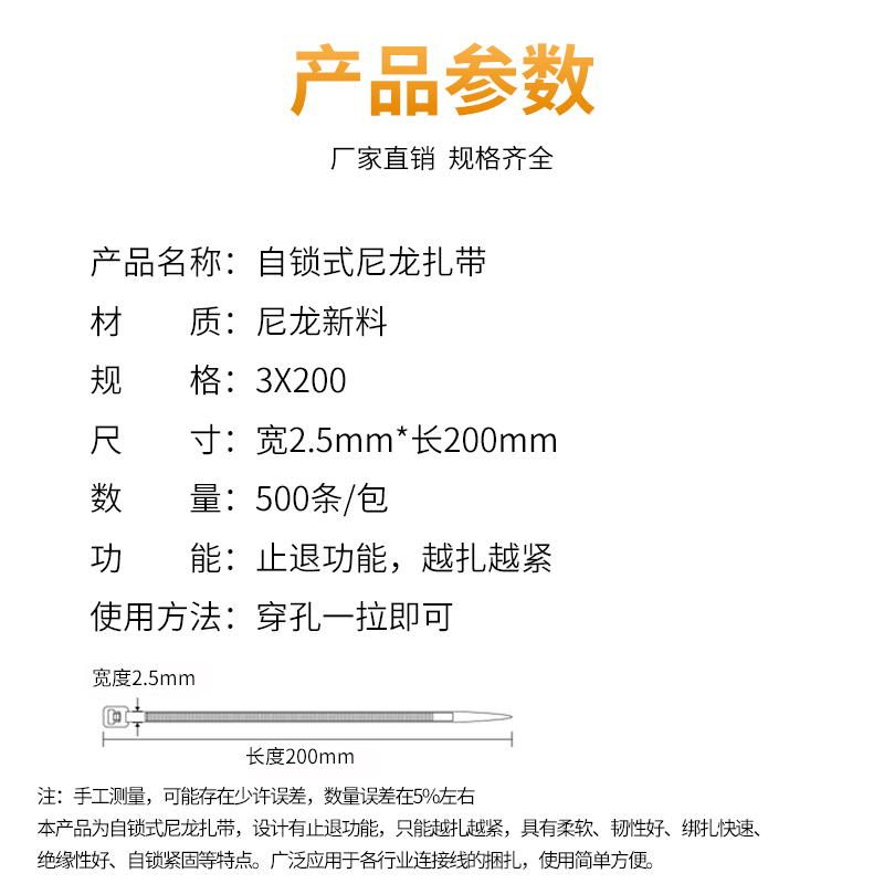 The national standard black 3*200mm self lock nylon tie 500 plastic harness binding belt