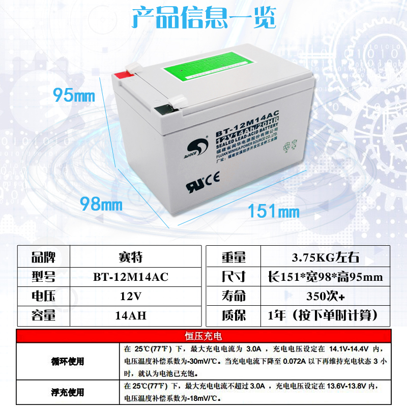 Saite BT-12M14AC battery 12V14AH 20HR access control UPS fire host 12 volt 14A battery
