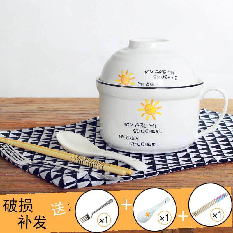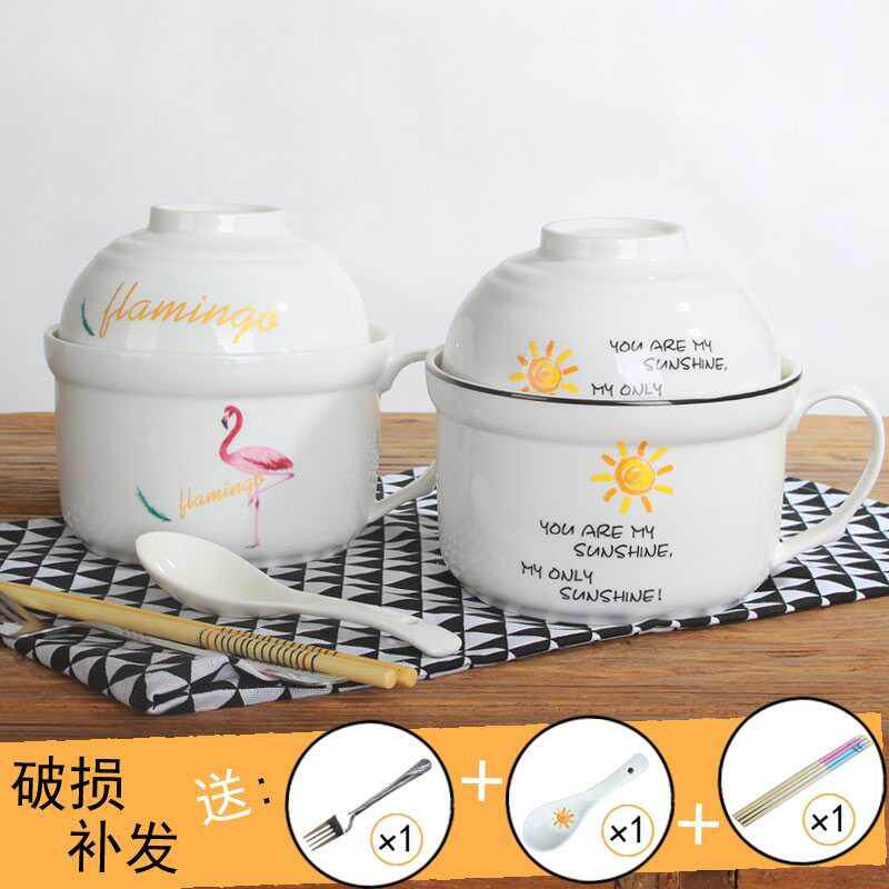 Cartoon Ceramic Bubble Noodle Bowl with lid Large number student cutlery set Home Lunch Box Cute Dorm Bowl Spoon Chopstick Fork