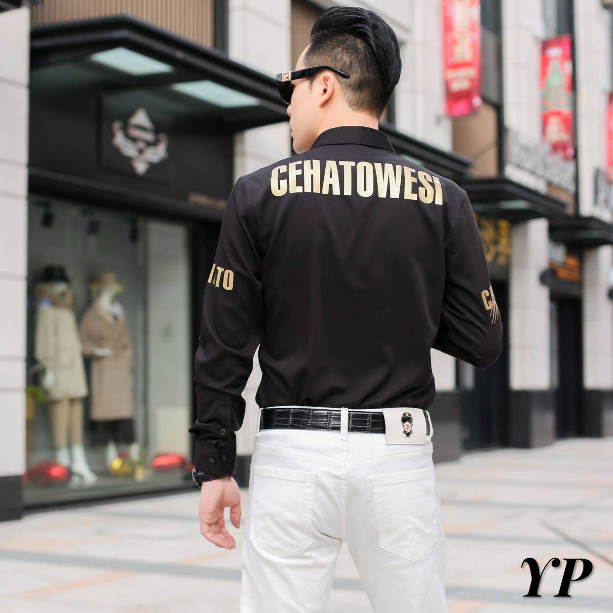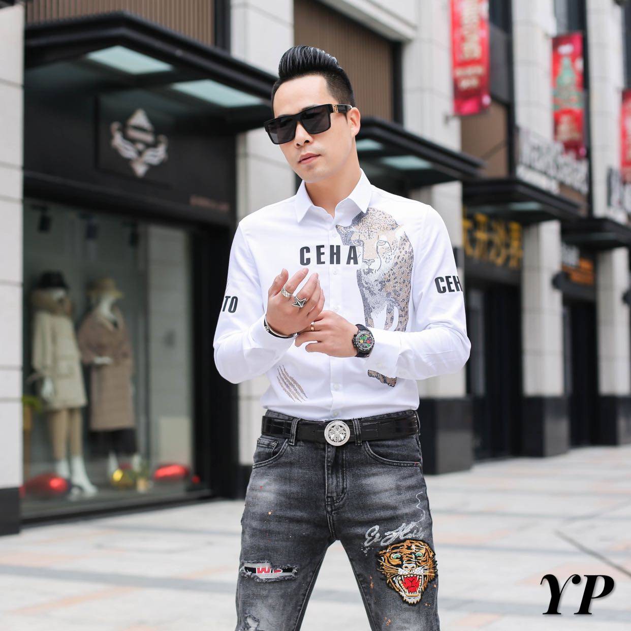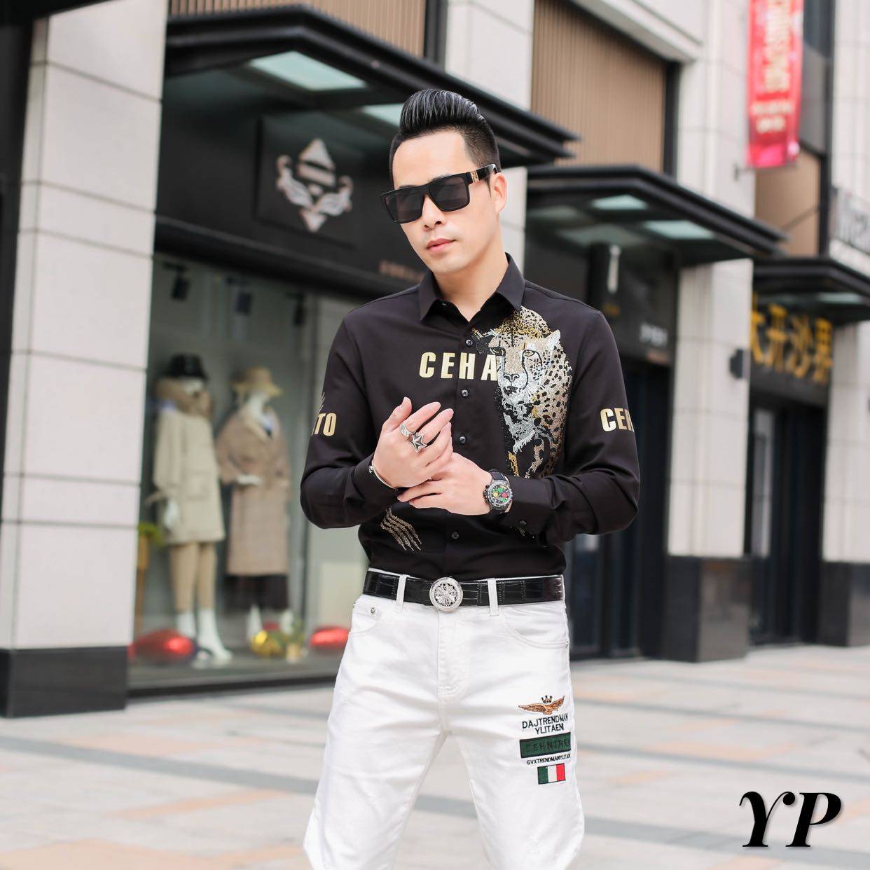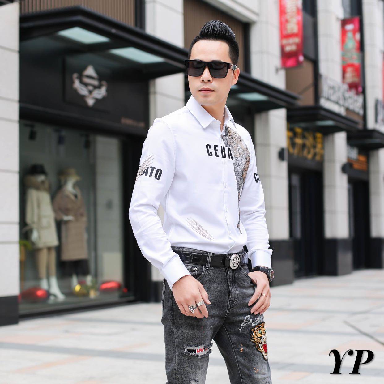 2020 Europe and America Chauded men's spring new personality Fashion casual youth handsome and hot drilling long sleeve shirt man