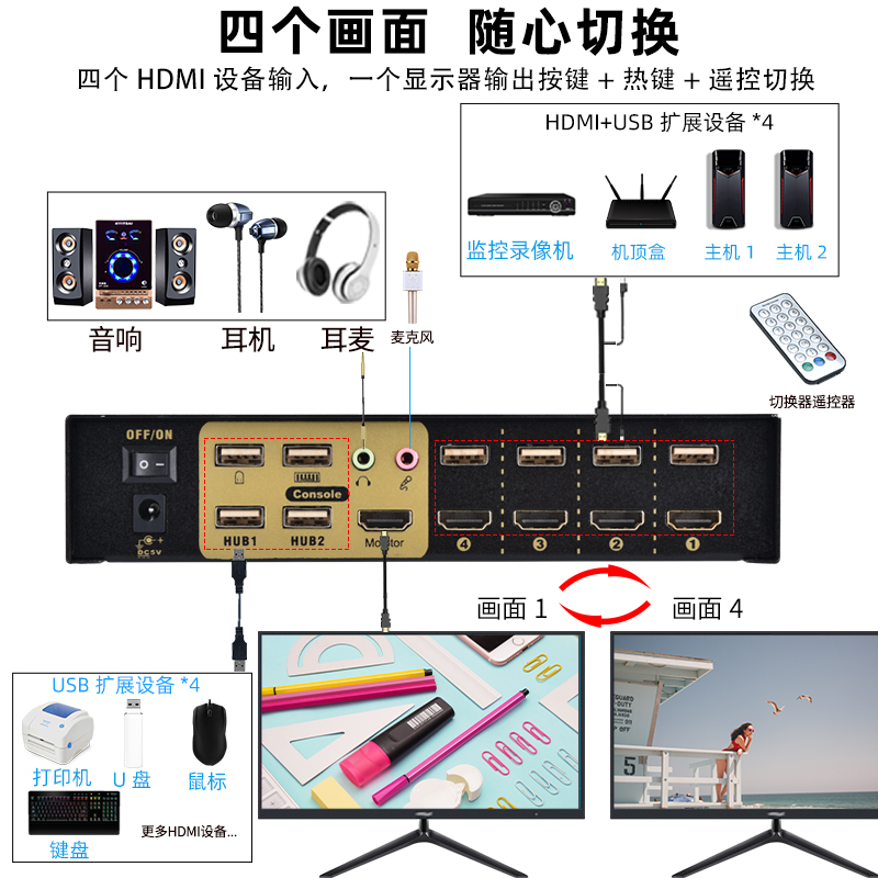 BOWU fully automatic 4-port hdmi switcher kvm4 in 1 out computer host server monitoring video recorder sharing a set of monitor USB keyboard rat 3.5 audio remote control hotkey 4k one drag four