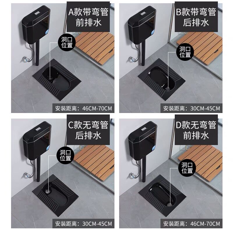 Black single squatting toilet (remark the drainage method) black no-bend rear water tank 304 water spray gun black with curved front row water tank 304 water spray gun If you need other drainage, please note the black water spray gun
