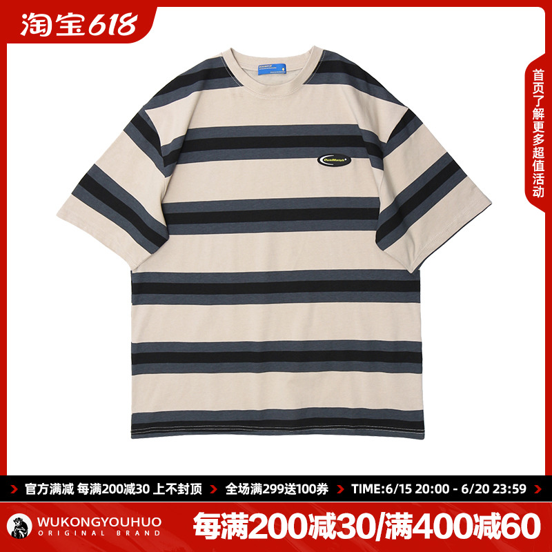 Wukong is in stock summer new trendy brand Japanese retro striped short-sleeved T-shirt male hip-hop loose all-match casual tops