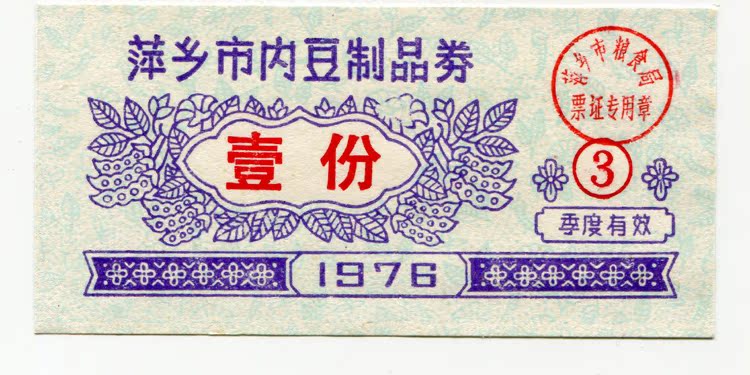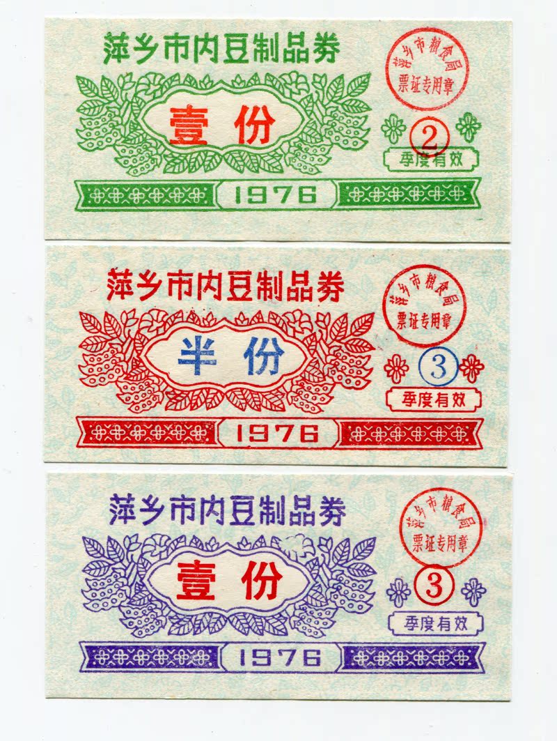 Brand new 1976 Jiangxi Pingxiang City Bean Products Voucher Three Sold Back White Grain Tickets