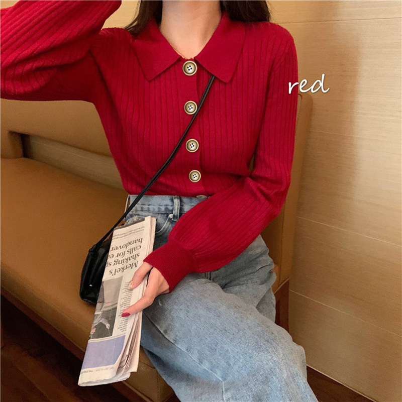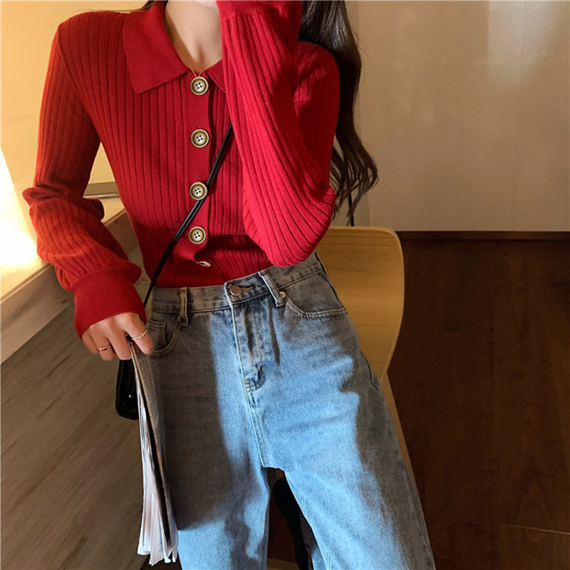 Red sweater women's spring autumn 2022 Ben's new Polo collar knit with undershirt and thick body blouse