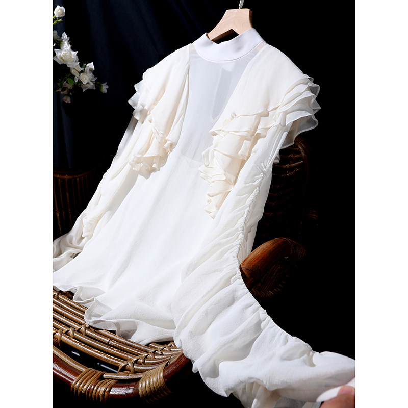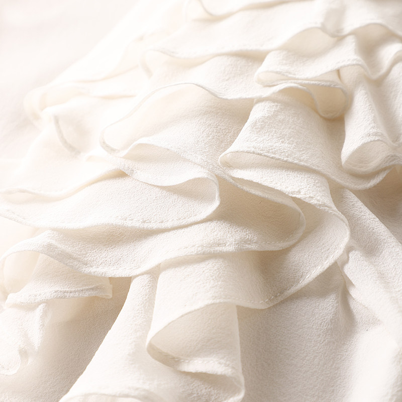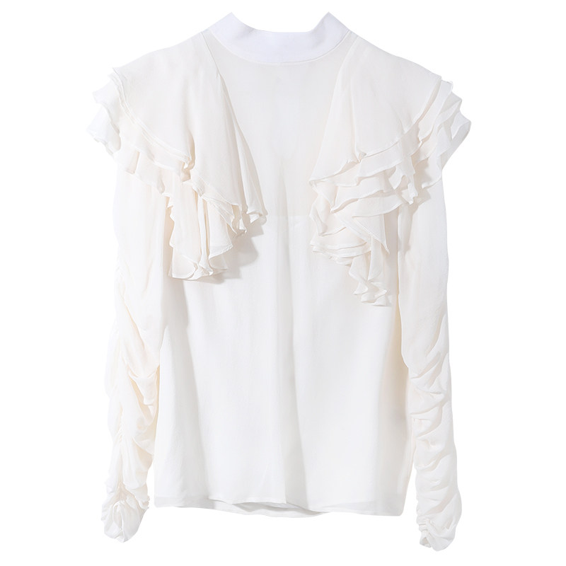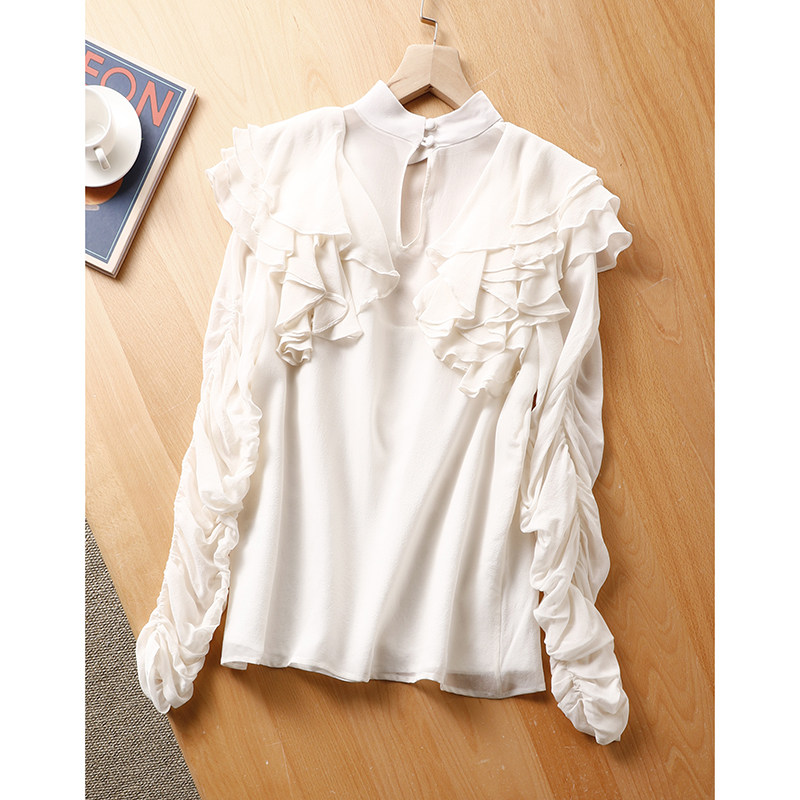 Quite heavy work and light luxury ~ hand-kneaded ruffles women's crepe de chine mulberry silk French white silk shirt 80141