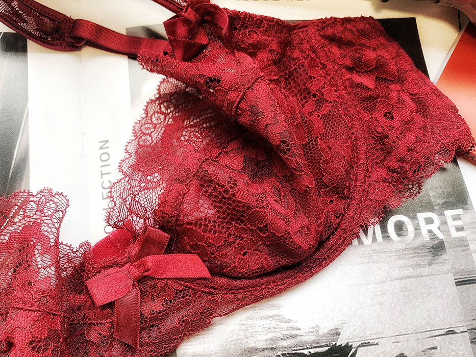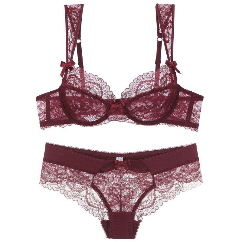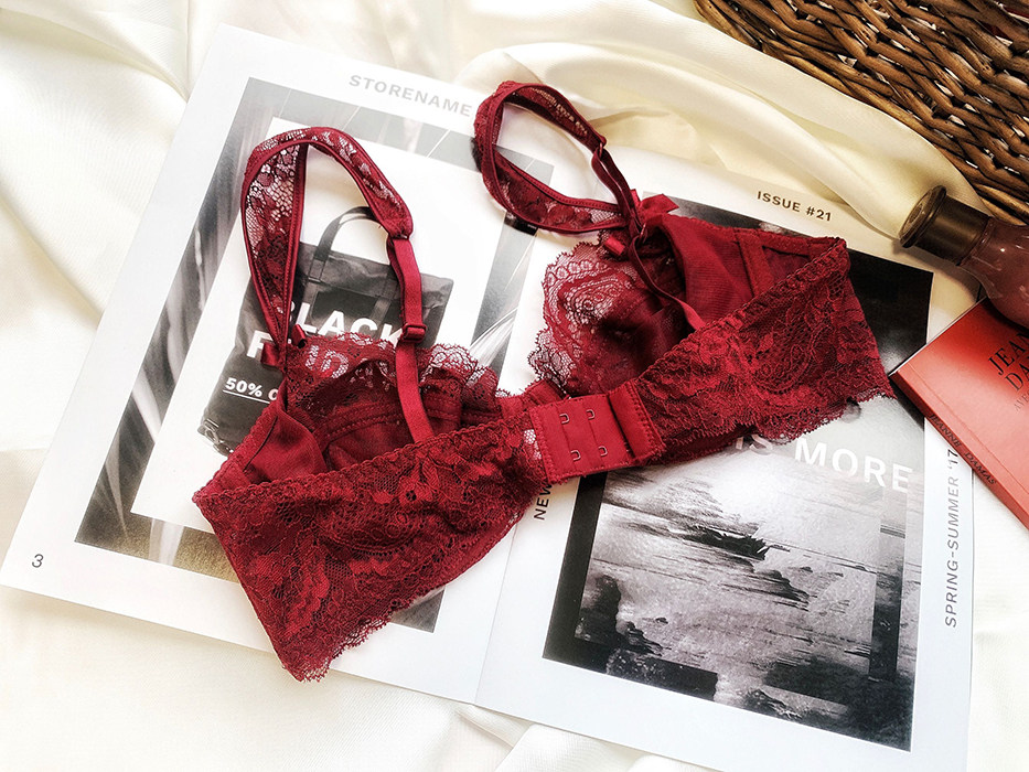 European and American ultra-thin translucent sexy lace underwear sweet large size burgundy 75D80D85D bra big chest becomes smaller