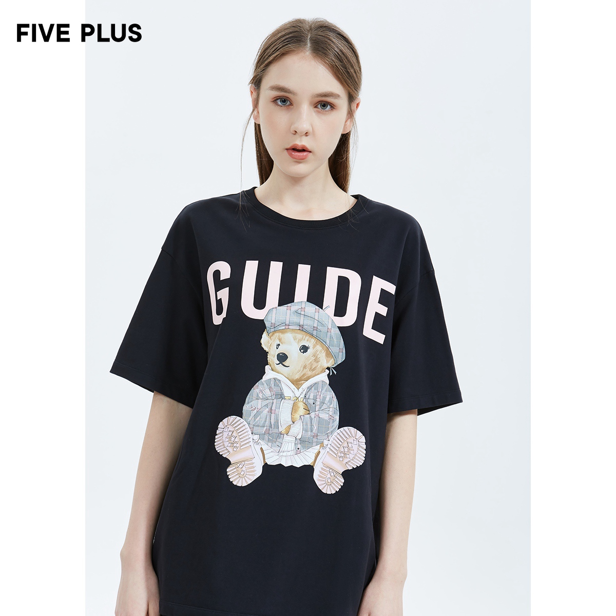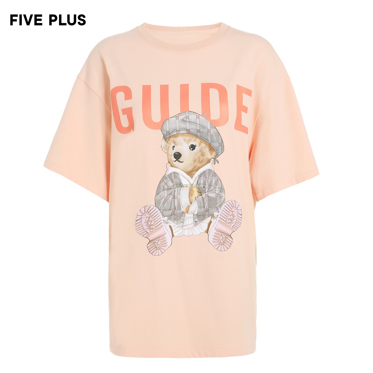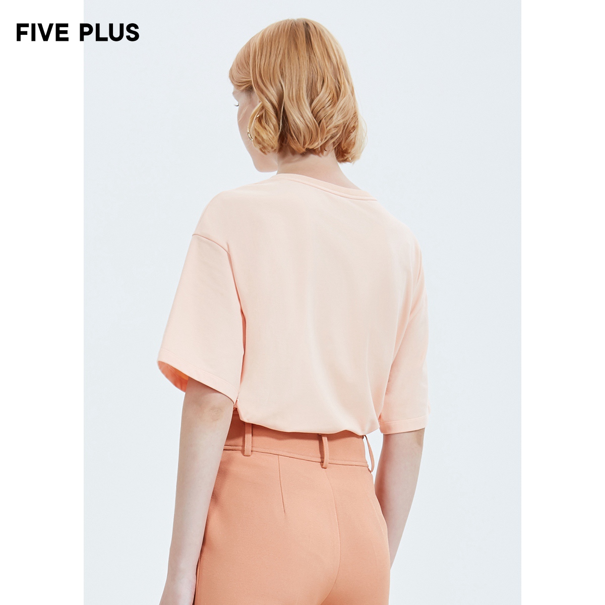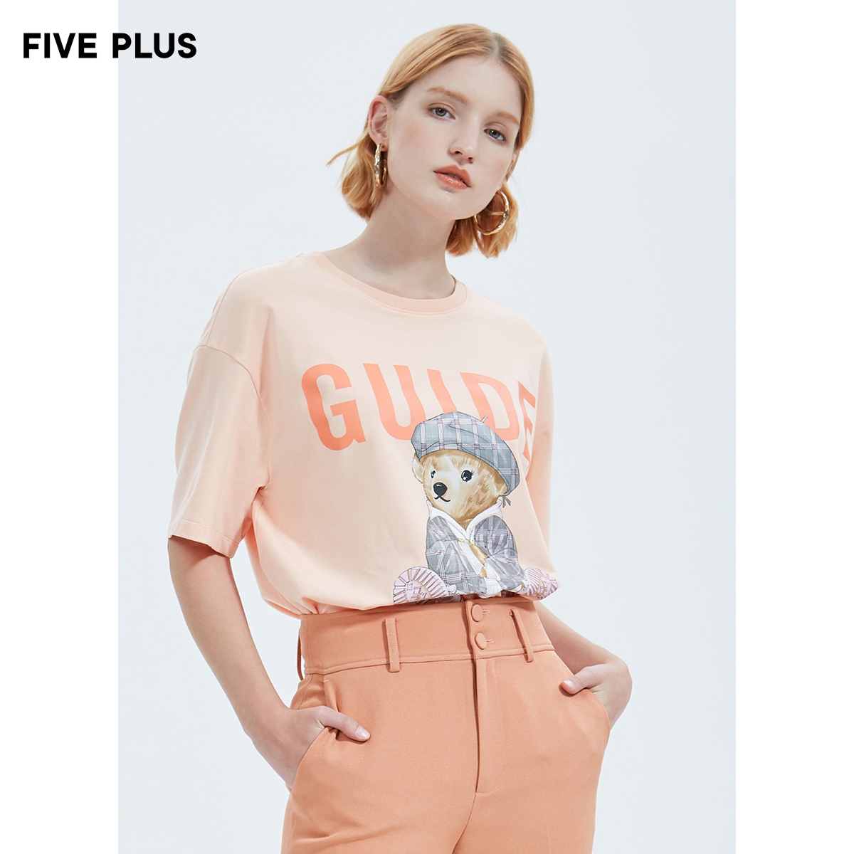 FIVE PLUS women's spring orange design T-shirt women's short sleeve loose cartoon pattern pullover