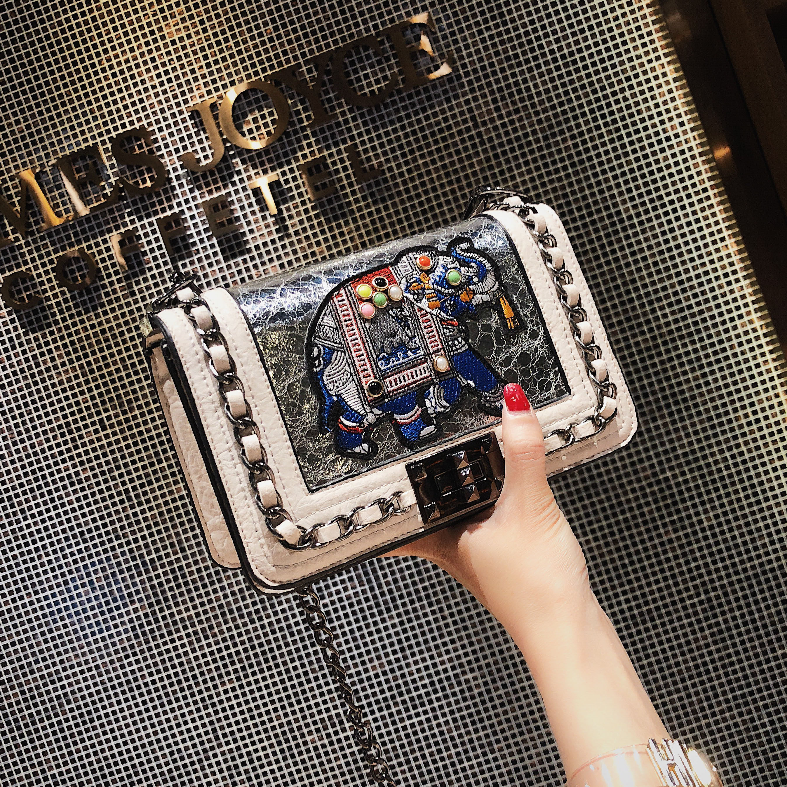 Lamode leather forest series small bag female 2019 New Tide Joker ins texture crossbody embroidery chain