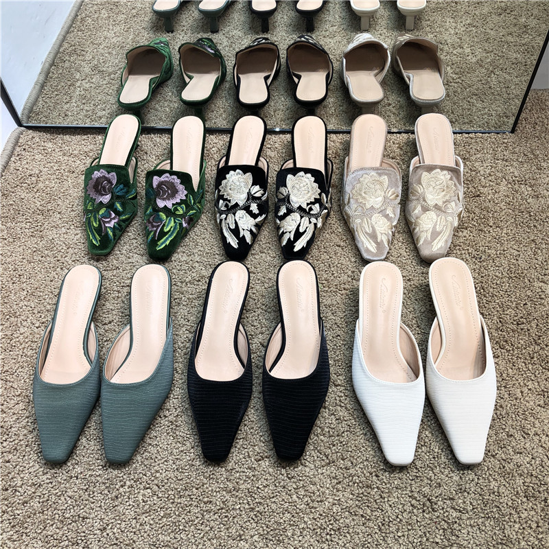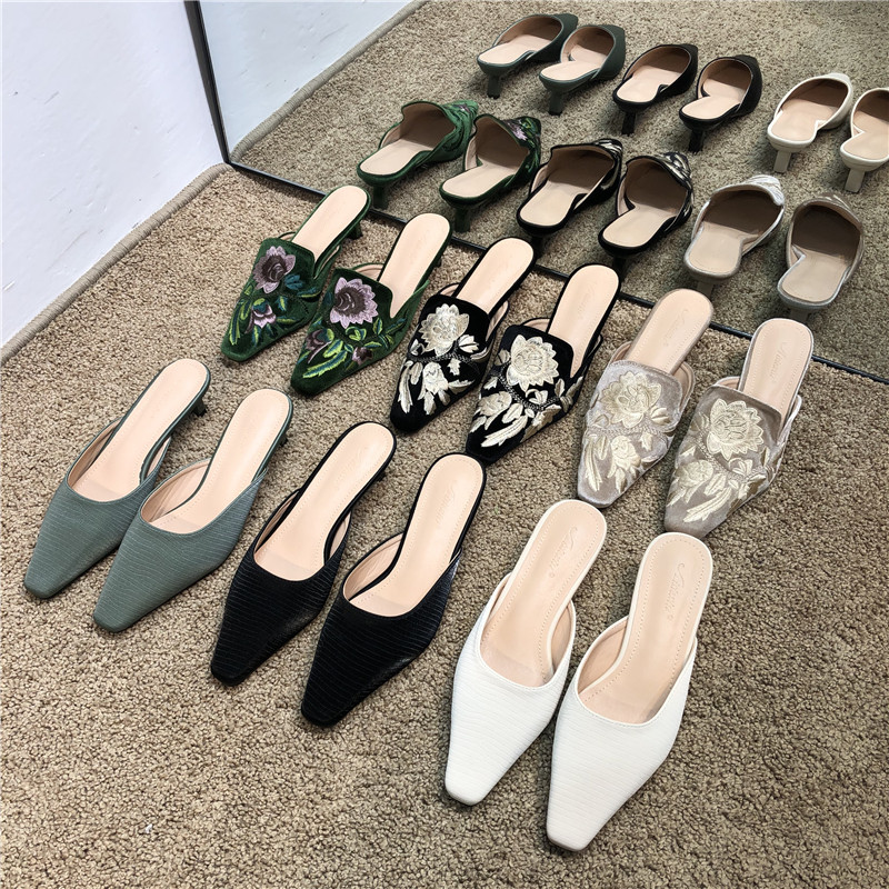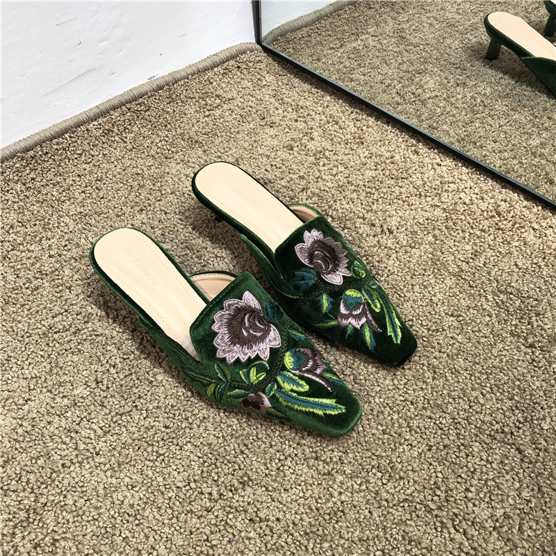 South Korea INS new square head embroidered flower high-heeled women's slippers 2022 spring style Baotou retro stiletto outer wear slippers