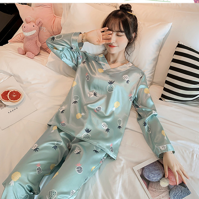 Ice silk pajamas women's long-sleeved spring, autumn and summer new V-neck real silk wide sexy candy pineapple home clothes two-piece set