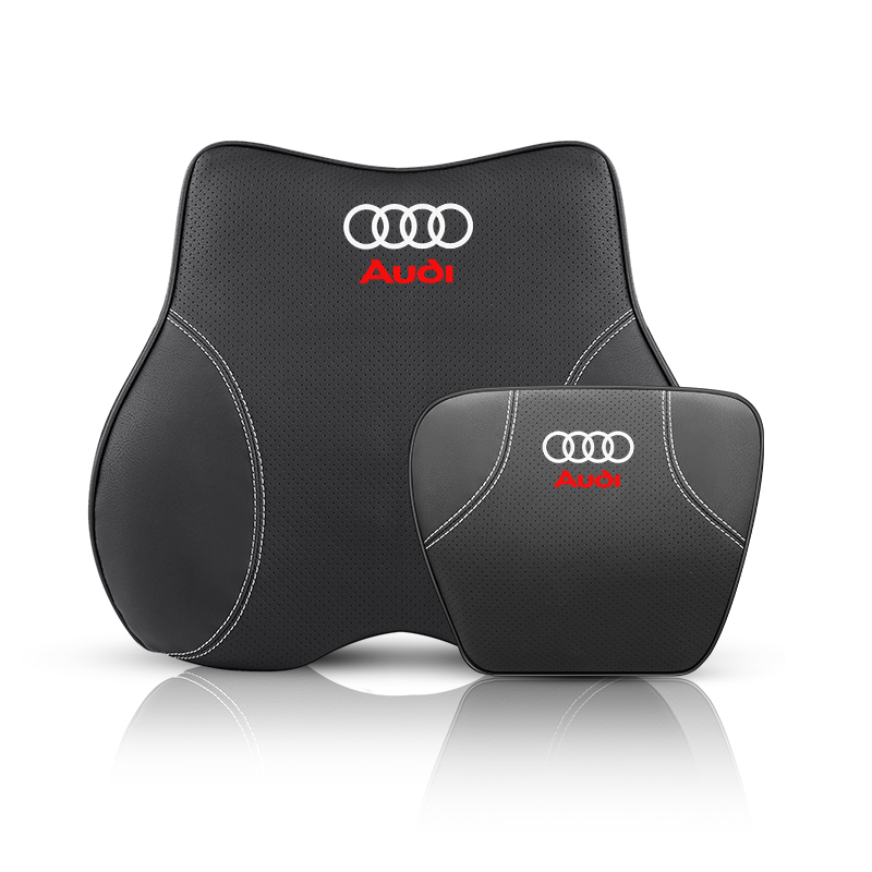 The Audi (Mocarbrown) headrest waist rests on each Audi (mysterious black) holding pillow by an Audi (cozy rice) headrest waist resting on one Audi (cozy rice) headrests One Audi (