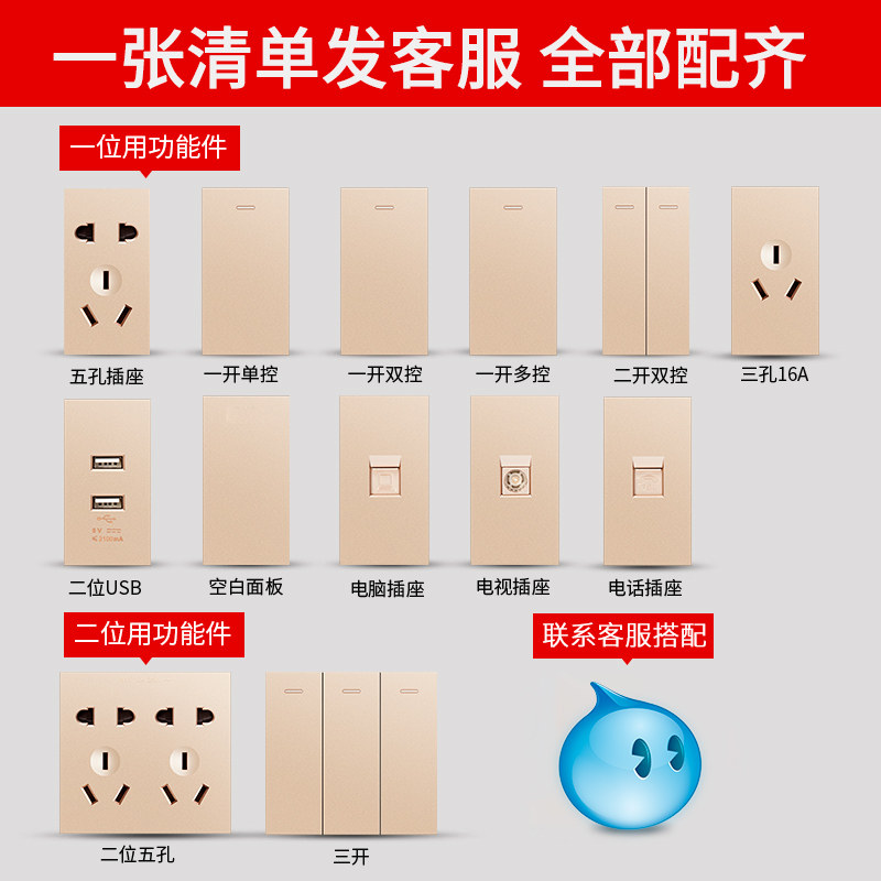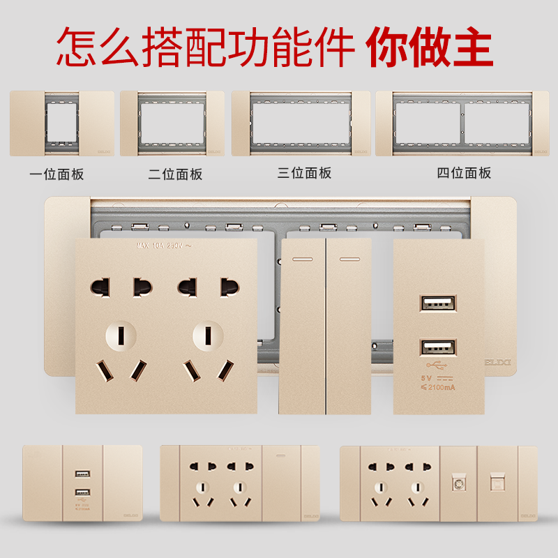 One panel Two-position panel Three-position panel Four-position panel Five-hole module (accounting for one position) Siamese ten-hole module (occupying two positions) Dual USB module (occupying one position) Three-hole 16A module (occupying one position)