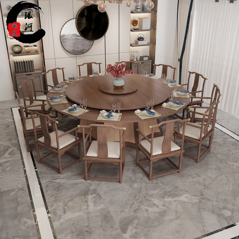 Hotel electric dining table New Chinese style 20-person solid wood large round table Club box automatic rotating hot pot table Log